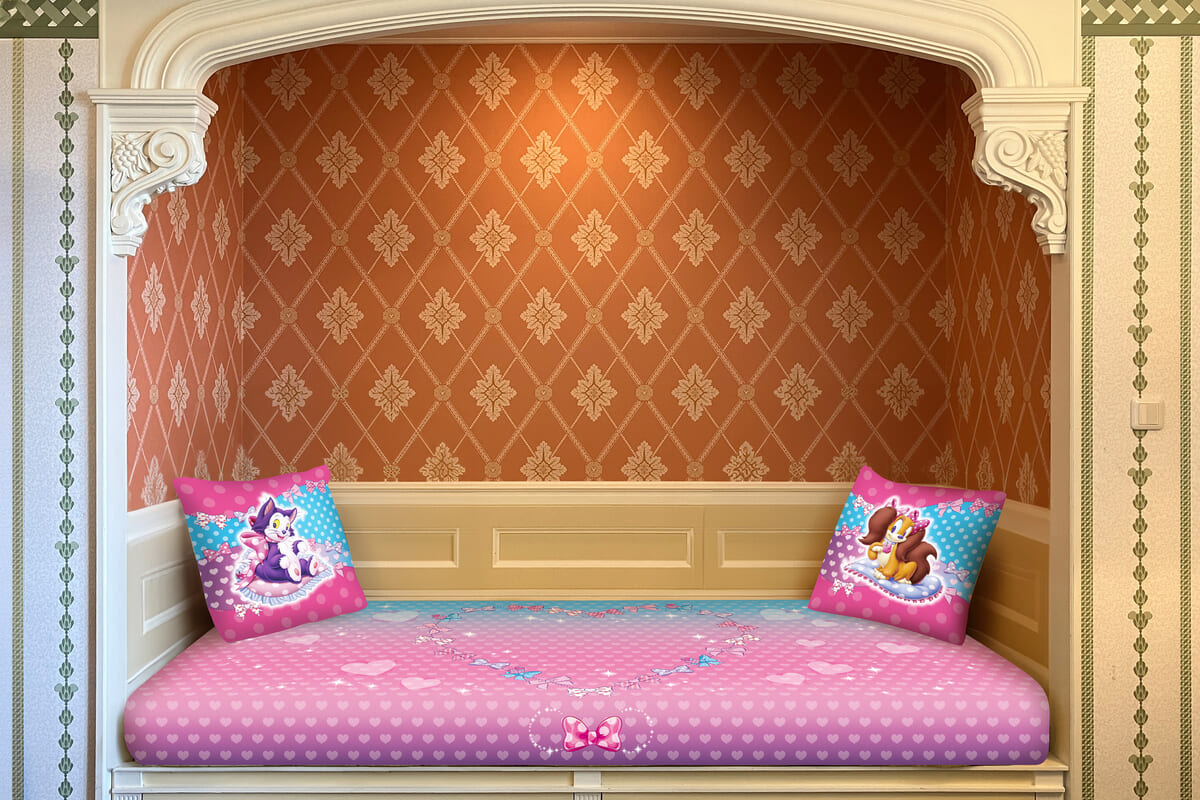 壁のくぼみを使用したアルコーヴベッドには、ミニーマウスが大好きなドット柄がデザインされたベッドカバーやミニーと仲良しのフィガロとフィフィが描かれたクッションがあしらわれています。