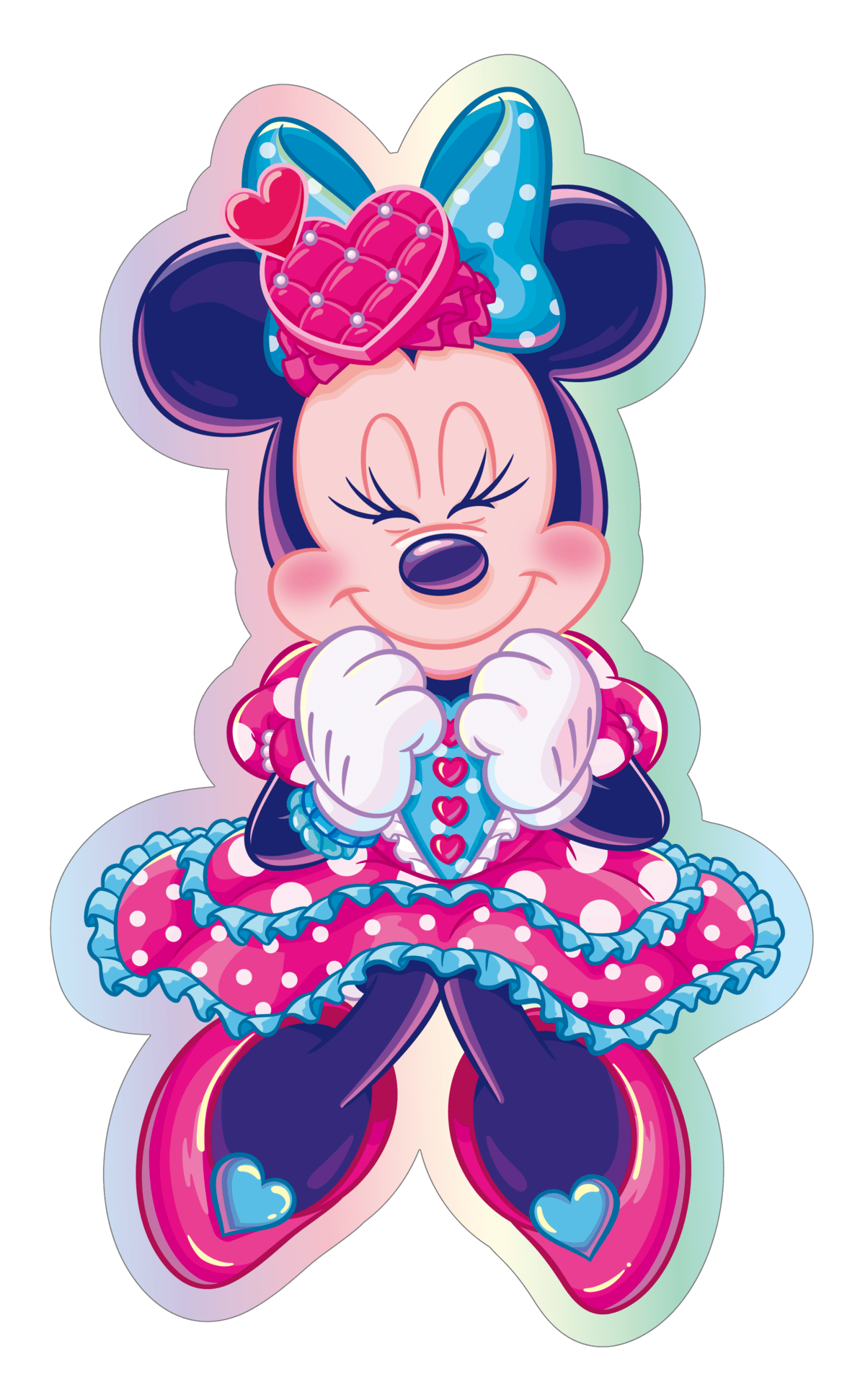 ピンクとブルーの衣装に身を包んだミニーマウスのオリジナルチャームが付きです